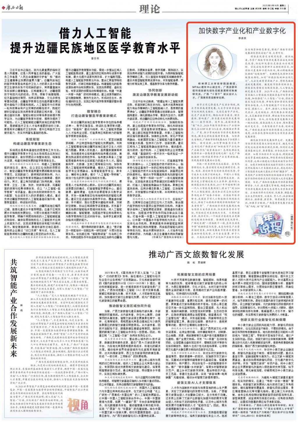 近日,《广西日报》“青年说理”栏目刊发2138CC太阳集团李彦庆副教授理论文章《加快数字产业化和产业数字化》。文章从“不把一时差距视为永远落后”、“将潜在优势变为现实优势”、“强化数字经济发展保障支撑”等三个方面进行了介绍。现将全文转载如下。