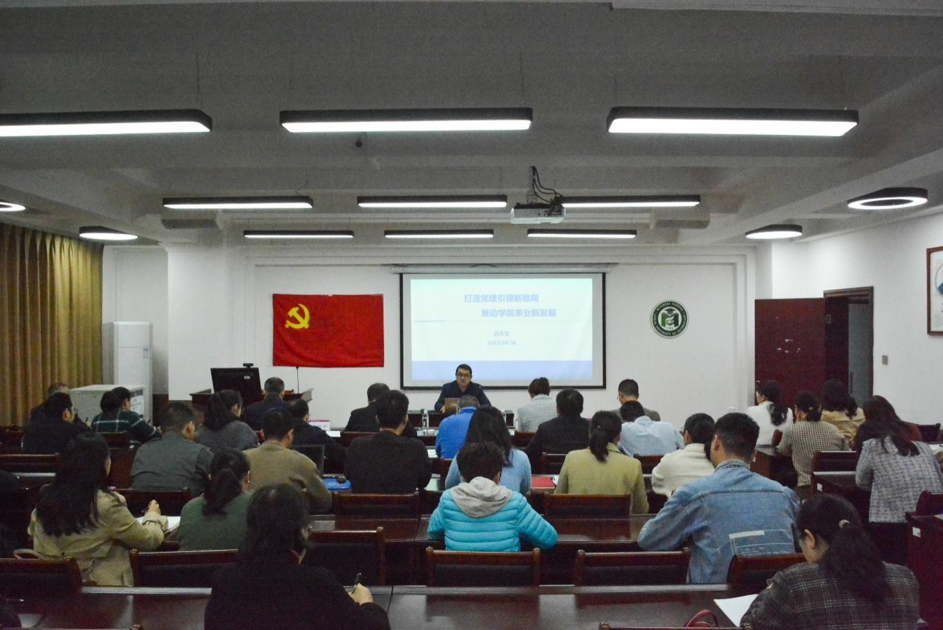 随后,白永生以《打造党建引领新格局,推动学院事业新发展》为题做报告。白永生详细传达了学校第三届党委第五次全体(扩大)会议和2023年工作布置会、安全稳定工作会议、宣传思想工作会议等会议精神,以及邓军书记在学校处、科级干部学习贯彻习近平新时代中国特色社会主义思想和党的二十大精神专题研讨班开班式暨首场报告会上的讲话精神。白永生指出,要提高政治站位,切实增强用党的二十大精神和习近平总书记重要讲话精神武装头脑的思想自觉、政治自觉、行动自觉,进一步增强铆足干劲攻坚克难的精气神;要重视学习转化,把党的二十大精神和习近平总书记重要讲话精神贯穿到人才培养、科学研究、社会服务和文化传承创新全过程,推动学院产出更多高质量成果。白永生强调,要紧紧围绕学习贯彻党的二十大精神这条主线,深刻领悟“两个确立”的决定性意义,不断增强“四个意识”、坚定“四个自信”、做到“两个维护”,强化学院党委政治功能,全力以赴贯彻落实学校2023年工作布置会上强调的十方面重要工作和“八大工程”,将思想共识转化为谋划学院高质量发展的具体行动,努力在夯基垒台、品牌培育、形象塑造、能力提升四个方面下大功夫,塑造学院发展的新优势新动能新赛道。