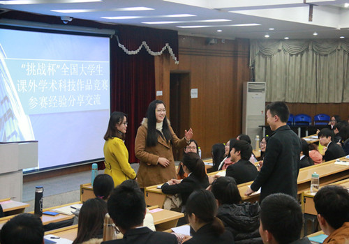交流会上,团队组长凌亚萍首先就团队组建、项目概况、赛事赛况、经验总结、感悟与展望等五个方面与全体学生干部分享经验,帮助同学们认识“挑战杯”,了解“挑战杯”,进而参与“挑战杯”。她表示,整个比赛历时两年,过程很艰辛,碰到过调研企业的不理不睬,碰到过学业与活动的时间冲突,碰到过团队成员出现内部分歧,但是他们都一路坚持了下来,现在回想起比赛过程中经历的种种,内心感觉所有的付出都是值得的。正是因为不断遇到问题,解决问题,培养了他们分析问题、解决问题的能力;正是因为遇到了挫折,才让他们学会了如何更加坚强;也正是因为风雨兼程一起走过,他们团队八人收获了一生“姐妹情”,这些都是人生一笔宝贵财富。在总结参赛经验时,她提出四点:一是学生干部要积极发挥榜样带头作用,努力做好项目规划、协调和实施;二是选题要切合社会热点和亟待解决的问题,增加作品的时代感;三是要加强与指导老师的沟通,积极寻找指导老师的指导;四是要有持之以恒,坚持不懈的精神,始终坚信收获远比付出的多。接着,参赛团队的张玉、李西等同学也积极与同学们分享了自己的参赛感悟,号召广大的同学积极参与科技创新活动,培养创新意识和创新精神,在丰富自己大学生活的同时为未来的发展打下坚实的基础。在互动交流环节,团队八名成员还积极与参会人员交流了如何进行问卷设计、如何开展项目调研等相关问题。交流会气氛热烈,同学们受益匪浅。
