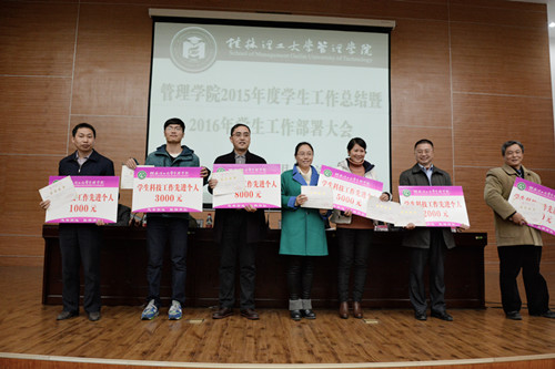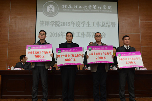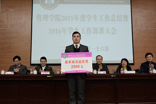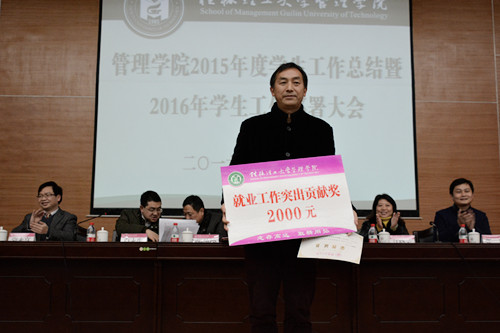 会上,全体参会人员起立,奏唱校歌,大会拉开序幕。江晓云副院长和蒙永亨副院长分别宣读了学生科技工作优秀指导教师表彰决定及毕业生就业工作先进集体和先进个人表彰决定。获奖单位及获奖个人在热烈而又鼓舞人心的掌声中接受与会领导的颁奖,获得就业质量最佳奖的人力资源教研室代表闫春老师、就业先进个人代表黄振育老师、学生科技工作优秀指导老师马小龙老师、学校优秀班主任代表邱建伟老师分别作了热情洋溢的发言。接着,学院党委副书记张瑞作2015届毕业生就业工作总结并部署2016年毕业生就业工作。学院院长连漪代表学院与各教研室负责人签订学院2016年毕业生就业工作目标责任状。