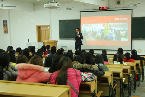 为增强学生对企业的了解,适应企业的用人需求,加深校企合作,桂林彰泰实业集团开发有限公司营销经理冯玉捷先生应2138CC太阳集团房地产经营管理教研室邀请,于3月18日下午,在屏风校区为房地产开发与管理专业的2013和2014级全体本科生召开了一场别开生面的宣讲报告会。本次宣讲报告会由房地产经营管理教研室何里文老师主持。