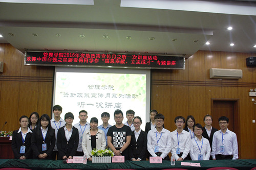为大力宣传国家资助政策,激励受助学生不断完善自我,全面提升自身的综合素质,实现个人成长成才,5月24日晚,学院励合社在屏风校区9501开展资助政策宣传月之“感恩奉献,立志成才”专题分享会。分享会邀请2015年度“中国大学生自强之星”廖雪梅同学担任主讲人,学院党委副书记张瑞,学院团委副书记曾丽萍、学院辅导员李鑫老师参加了分享会。