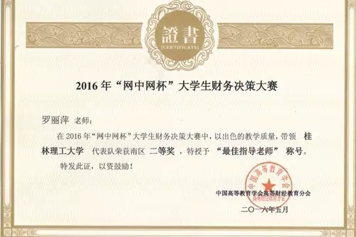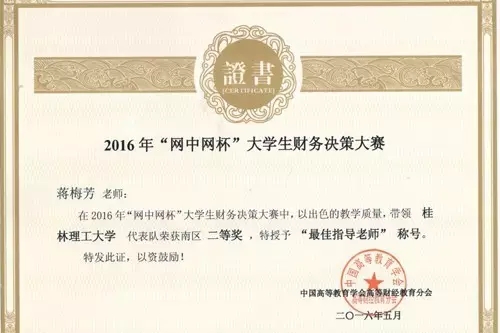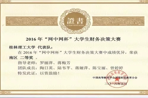 2016年5月29日,2016年度全国“网中网杯”大学生财务决策大赛圆满落幕。大赛由中国高等教育学会高等财经教育分会主办,厦门网中网软件有限公司、厦门网中网财务技术有限公司联合承办,共分六个大区。其中南区包含福建、广东、广西、海南、江西五个省区的高等院校。在罗丽萍、蒋梅芳老师指导下,2138CC太阳集团会计专业学生陶日英、陆韦芊、蒋娅萍、陈宝丽、曾婷婷五位学生代表学校参加比赛,取得南区二等奖的好成绩,在广西参赛高校中排名第一。同时,两位指导老师被授予“最佳指导老师称号”