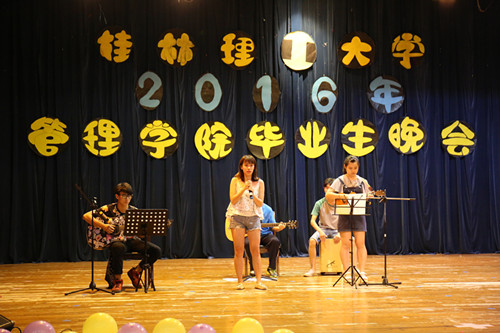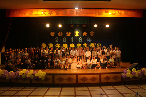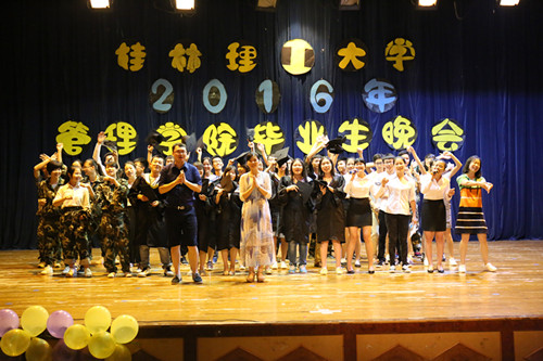 随后,由12级毕业生带领的跳伞塔乐队带来的歌曲《广西山歌大联唱》正式拉开晚会帷幕,接着,舞蹈、朗诵、钢琴独奏、情景剧等节目也接踵而至。国贸、营销第二党支部带来的情景剧《理工,我们的大学时光》带领毕业生们回顾了大学四年的美好时光,毕业生们表演的舞蹈《我们约好了一起跳广场舞》、诗朗诵《惜别桂工,相约十年》、歌曲《十年》、《好久不见》等节目表达了毕业生对母校的依依不舍之情,现场掌声不断,高潮不断。同时,现场四段《大学时光》的视频贯穿整场晚会,勾起毕业生对大学生活的无尽回忆,现场温情不断,感动不断。晚会末尾,毕业生们互送明信片、互道珍重,用歌声、拥抱、合影去惜别四年的同窗和恩师,礼堂内既有毕业的快乐,又有不舍的师生和同窗情谊,礼堂变成了一片温暖欢乐的海洋。
