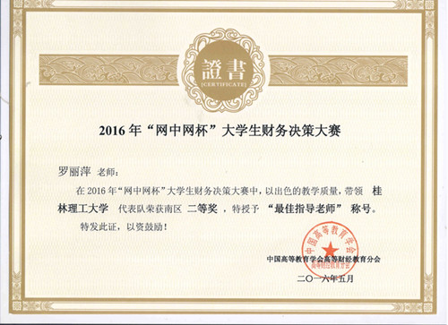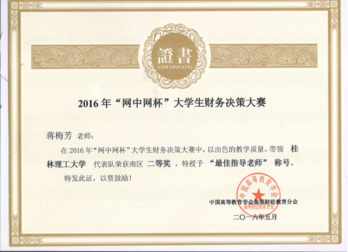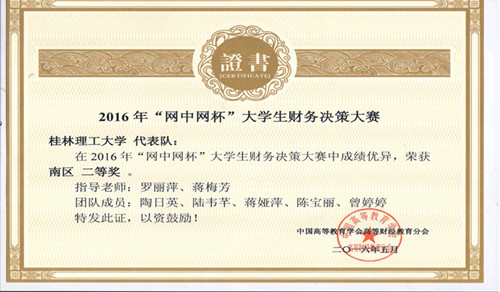 由中国高等教育学会高等财经教育分会主办,厦门网中网软件有限公司、厦门网中网财务技术有限公司联合承办的2016年度“网中网杯”大学生财务决策大赛于2016年5月29日圆满结束,全国分六个大区进行,南区大赛覆盖了福建、广东、广西、海南、江西五个省区的高等院校。2138CC太阳集团会计专业学生陶日英、陆韦芊、蒋娅萍、陈宝丽、曾婷婷五位学生代表学校参加了比赛,在罗丽萍、蒋梅芳老师指导下,取得南区二等奖,广西参赛院校中排名第一。两位指导老师被授予“最佳指导老师称号”。
