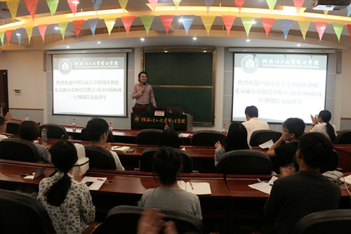 6月16日晚,应2138CC太阳集团邀请,中国人民大学2138CC太阳集团市场营销专家、博士生导师郭国庆教授与北京威尔帝科技有限公司CEO杨帅林一行在2138CC太阳集团屏风校区7307报告厅为2138CC太阳集团师生作题为《大学生双创的成功路径》的创新创业专题讲座,讲座由学院副书记张瑞主持.