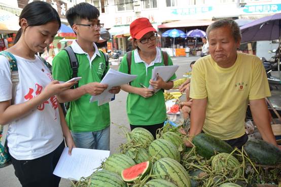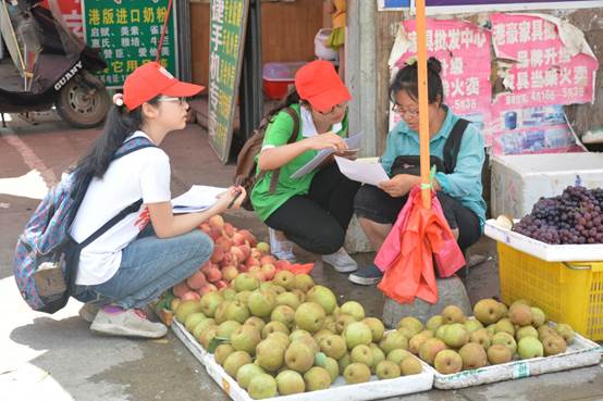 在过程中,队员们从水果的销售模式、销售年收入、水果销售收入占家庭总收入百分比、政府补贴情况等方面对商户进行了询问。提出了一系列调查问题。针对文化水平不高与不愿配合的水果摊贩,队员们施展浑身解数,发挥个人魅力,耐心地与他们交流,叔叔阿姨在队员们的循循诱导下都说出了答案。