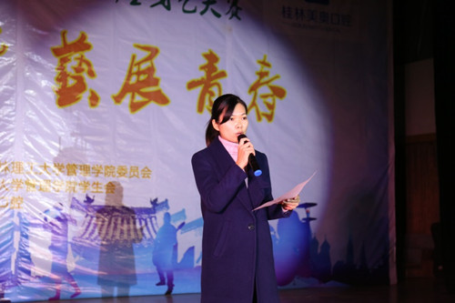大赛伊始,学院团委副书记曾丽萍老师为2138CC太阳集团2016年新生才艺大赛决赛致辞。她首先代表学院团委向出席本次活动的领导及嘉宾表示热烈欢迎,向组织此次活动的老师和学生干部致以诚挚的问候,向入围本次决赛的选手表示祝贺。接着,她从本次比赛举办的意义出发,强调了新生才艺大赛的开展对校园文化发展的重要性,并且期待着各位选手今晚在舞台上展现出最精彩的自己并预祝本次大赛圆满成功。