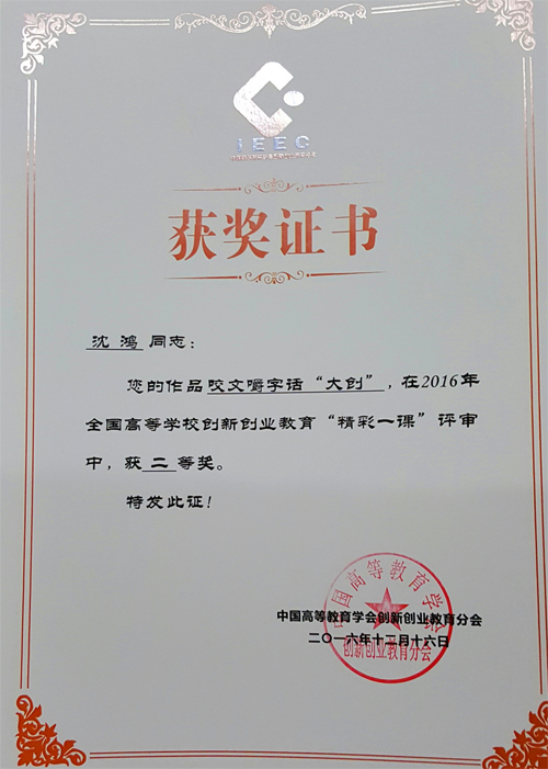 12月16日,中国高等教育学会创新创业教育分会2016年工作年会暨第七届全国高校创新创业教育高峰论坛在东北大学召开。会议总结了一年来的工作,对在全国高等学校创新创业教育工作中涌现出来的19个先进集体、83先进个人和48篇优秀论文以及创新创业“精彩一课”24 门进行表彰。其中2138CC太阳集团教师马小龙老师主讲的课程《创业学》获得“精彩一课”一等奖,沈鸿老师主讲的课程《咬文嚼字话“大创”》获得“精彩一课”二等奖。