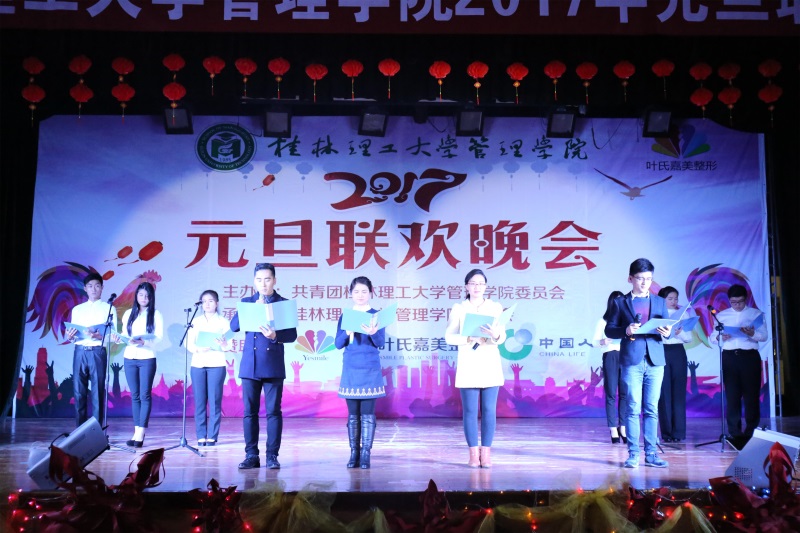 晚会上,南礼堂张灯结彩,观众们欢聚一堂,处处都是新年的欢乐气息。晚会伊始,学院党委书记周章明老师为晚会开幕致辞。周书记在致辞中回顾了2138CC太阳集团2016年在教学科研、学科建设、专业学科竞赛、文体活动等方面取得的累累硕果,同时代表学院党委行政对一年来为学院发展建设默默奉献的全体师生表达感谢,最后周书记表达了希望管理学院全体师生在新的一年中同心同德、奋发图强,为学院各项发展建设再创佳绩的美好期待。