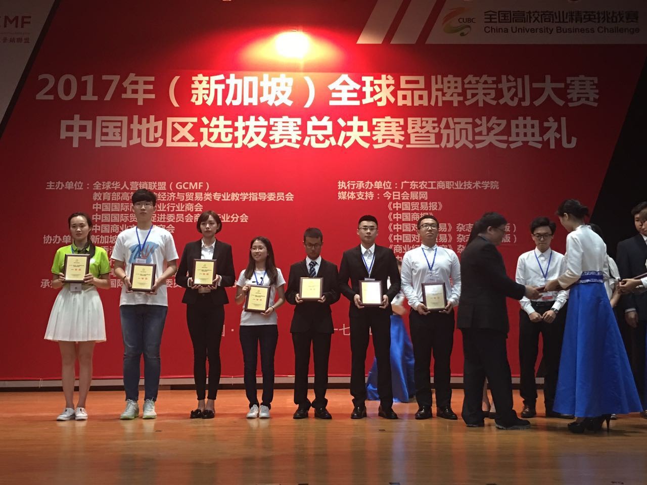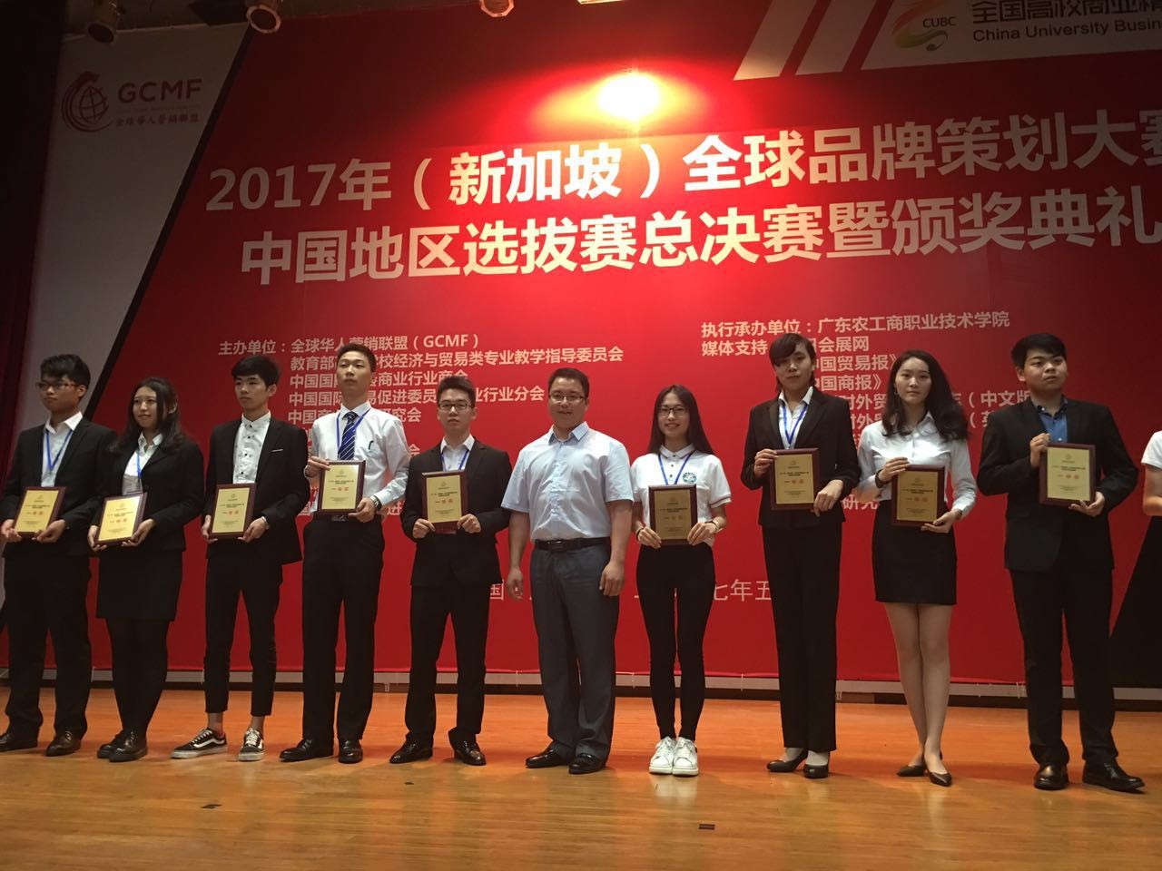 2017年5月6-8日,由全球华人营销联盟(GCMF)、中国国际贸易促进委员会商业行业分会、教育部高等学校经济与贸易类专业教学指导委员会、中国国际商会商业行业商会和中国商业文化研究会共同主办,第六届全球品牌策划大赛中国区决赛在广州圆满结束。本次大赛分初赛和决赛两个阶段,前后历时五个月,共有来自全国23个省市自治区、直辖市的300多支参赛队伍参加。经过层层选拔,最终有山东大学、北京工商大学、福州大学、上海对外经贸大学和桂林理工大学等84所高校的151支团队入围中国地区选拔赛总决赛。决赛阶段,由2138CC太阳集团市场营销系梁健爱、尧丹俐和周晓睿三位老师指导,市场营销专业刘日威、黄泳琳、李竹君、覃焕玲、陈灵利、邱先奎和乔阳阳7名同学组成的《悦太极品牌策划》和《金顺昌品牌策划》2支参赛团队均夺得2017年全球品牌策划大赛中国区决赛一等奖。其中,周晓睿老师指导的《金顺昌品牌策划》团队成功晋级八强,获得代表中国大陆地区参加2017年(新加坡)全球品牌策划大赛总决赛的资格。