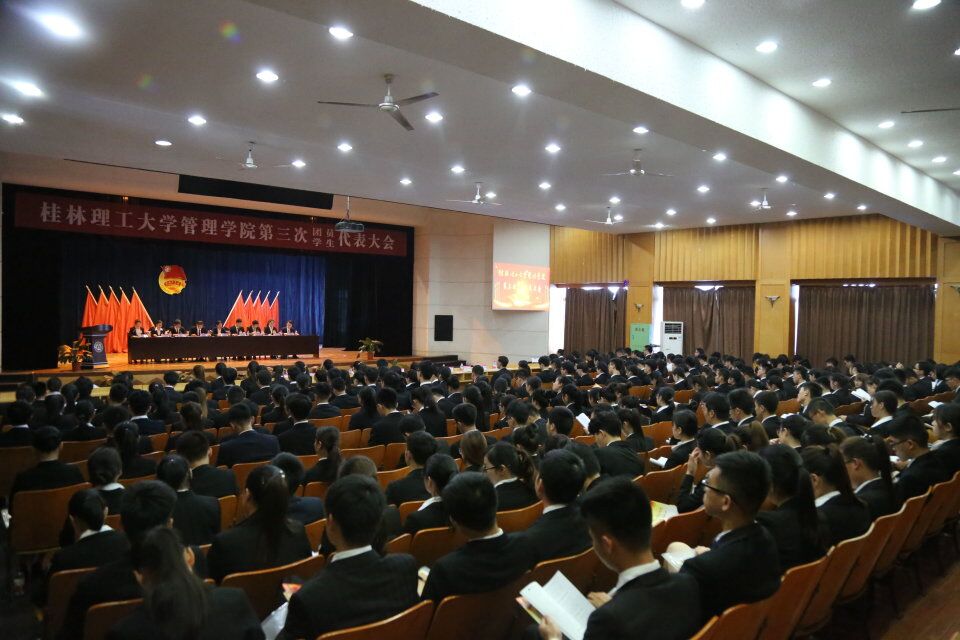 2017年5月13日,桂林理工大学管理学院第三次团员、学生代表大会在屏风校区南礼堂隆重召开。学院党委书记周章明、校团委副书记潘思伊、学院党委副书记张瑞、学院学工组长沈菲菲、学院团委副书记曾丽萍、学院各学生组织指导老师及校学生会副主席岑鸿杰应邀出席会议,学院各年级251名团员学生代表参会,会议由学院学生会副主席丁天一主持。广西师范大学经济管理学院、桂林电子科技大学2138CC太阳集团、桂林医学院人文与管理学院、桂林航天工业学院管理学院、桂林旅游学院国际2138CC太阳集团、、广西师范大学漓江学院管理系、桂林电子科技大学信息科技学院管理系、桂林理工大学博文管理学院经济与管理学院等八所高校院系发来贺信贺电。