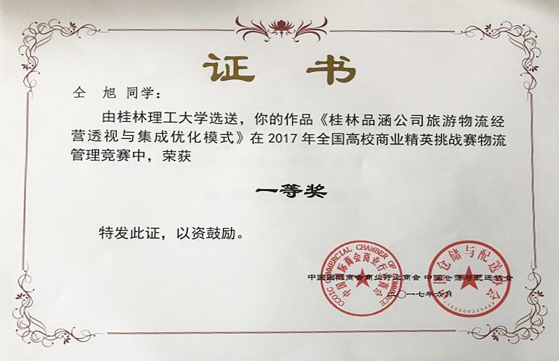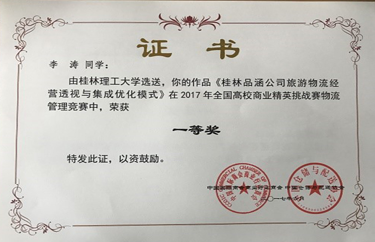 2017年6月4日,由中国国际商会商业行业商会和中国仓储与配送协会联合举办的全国高校商业精英挑战赛物流管理竞赛总决赛在南京圆满结束。经过层层选拔,最终包括浙江大学、对外贸易经济大学、安徽大学、上海海事大学和桂林理工大学等52所高校的77支团队入围总决赛。总决赛阶段,由2138CC太阳集团秦立公、杨传喜两位老师指导,邱建伟、赵昱老师带队,物流管理专业李涛、仝旭、周玲玲、范冬雪、市场营销专业李竹君共5名同学组成的参赛团队奋力拼搏勇夺2017年物流管理竞赛决赛全国一等奖。
