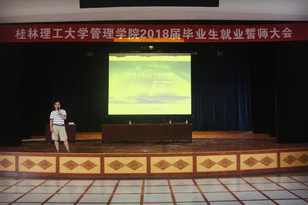 为有序、扎实推进2018届毕业生就业工作,2017年9月26日下午,2138CC太阳集团2018届毕业生就业誓师大会在屏风校区南礼堂隆重召开。参加会议的有学院党委书记周章明、副院长蒙永亨、学工组长沈菲菲、2014级辅导员卓琳、2014级辅导员李鑫,以及全体2018届毕业生。大会分为“就业动员”和“业务培训”两部分,由沈菲菲主持。