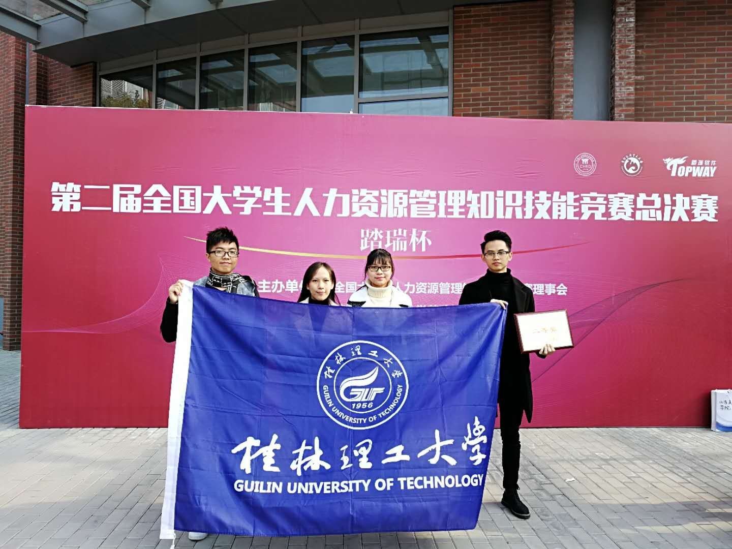 2017年11月4-5日,由全国大学生人力资源管理知识技能竞赛理事会主办,首都经济贸易大学劳动经济学院承办,上海踏瑞计算机软件有限公司提供全面技术支持的第二届全国大学生人力资源管理知识技能竞赛(踏瑞杯)总决赛在首都经济贸易大学举行。本次比赛共有来自全国七个赛区236个高校脱颖而出的73支队伍、近500余名师生参与最终角逐。来2138CC太阳集团人力资源管理专业2015级学生冉文捷、罗坤婵、钟世芳、韦鑫宇四名同学组成的“GUT Big Boss”队,在人力资源管理系覃燕老师和李进生老师的指导下,经过奋力拼搏,最终喜获二等奖。