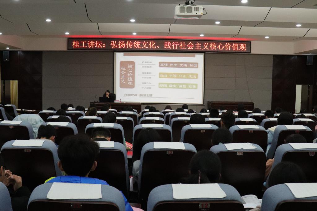 2017年11月22日下午16:00,应学院团委邀请,理学院党委副书记孙巍老师做客2138CC太阳集团桂工讲坛,在雁山校区逸夫楼报告厅为2138CC太阳集团2017级学生开展了题为《弘扬传统文化,践行社会主义核心价值观》的专题讲座,学院辅导员张雪老师主持讲座。