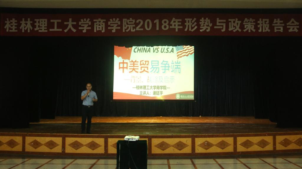 谢廷宇老师从2018年中美贸易争端的最新进展切入,详细介绍了中美贸易争端的背景及原因,中美贸易争端的领域、诉求及策略等内容,用生动的语言、权威的数据把中美贸易摩擦持续升级的过程进行回顾和梳理,让同学们对于中美贸易战的势态发展有最新认识。在报告会尾声,谢廷宇老师用“风声雨声读声声声入耳,家事国事天下事事事关心”的对联激励同学们,并向在场的同学们提出几点期望:一、面对国内外复杂形势必须要有大局观,保持理性;二、坚决拥护党的领导;三、深刻认识时代赋予我们的责任;四、励志、求真、力行,做奋斗者和实干家。