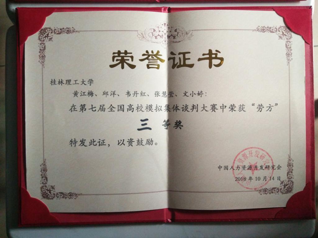 2018年10月13至14日,人力资源管理系刘黔川、覃燕两位指导老师带队,人力资源管理专业黄江梅、艾甜等十名同学组成的“资方”、“劳方”两支参赛队伍参加了第七届全国高校模拟集体谈判大赛。并荣获“资方”三等奖,“劳方”三等奖,韦丹红、艾甜两位同学荣获“优秀谈判员一等奖”,刘黔川,覃燕两位指导老师荣获优秀指导老师一等奖。