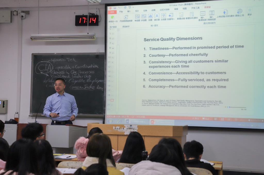 李隽波教授为了将学生培养成为既有扎实的专业知识又具备东西方管理思维的现代化企业管理人才,他一直致力于工商管理本科、硕士课程的双语教学工作。在双语教学中,他基于构建主义理论和系统论,注重双语学习中情境、协作、会话和意义建构的四大要素,发挥双语教学系统中主体与客体的主观能动性和协调互动作用,通过先进的教学介体、方法、手段,构建双语学习情境,培养和提高学生的协作与会话能力,促进学生双语学习的意义建构。选用国外著名的Stephen P. Robbins和Mary Coulter英文原版影印教材《Management》,采用统一教案,规范双语学习流程。设计多媒体课件,运用课程网络教学系统,帮助学生在线学习,设计课程作业(coursework),使学生适时运用理论知识解决实际问题,提高学生们的协作能力,解决理论与实际相结合的难题。经过不懈努力,李隽波教授负责的《管理学》(双语)课程获得了国家双语教学示范建设课程立项,这是2138CC太阳集团高等教育质量工程建设中取得的重要标志性成果之一。
