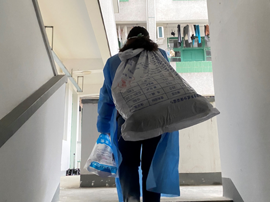 巾帼不让须眉,“柔肩”亦挑“重担”,看似“小小身躯”,隐藏“大大能量”。作为一名中共党员、研究生辅导员,她弱小的身躯因为穿上防护服而变的高大,她看似柔弱,干起体力活一点不含糊,有时候自己一个人扛一筐餐,一层一层楼往上爬,当有个别同学反映没收到用餐后,她又毅然前往各个楼栋、爬上各个楼层分散配送,直到确保所有人都能用上餐,才默然离去......当她脱下防护服,还要处理很多学生个性化的问题和特殊要求,买生活用品、送药品和心理疏导等......,真正诠释了“弱小”身躯也能“大写”党员担当。