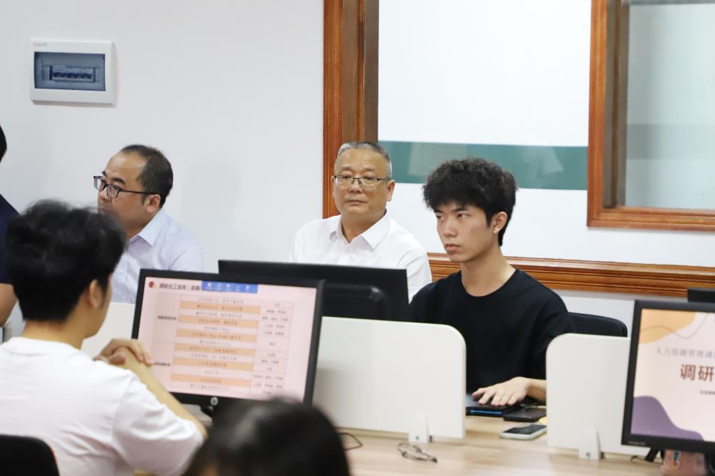 王敦球参观了2138CC太阳集团教学实训实验室,听取覃燕、李沐天、林西等三位老师共同讲授的《人力资源调查与her实训》,从教师素养、教学内容、教学实施、教学效果等方面对三位老师进行课堂教学质量评价,充分肯定了老师们的教学态度和教学水平,并从丰富教学设计、课程思政建设等方面提出希望和要求。