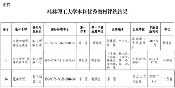 近日,学校公布了2023年桂林理工大学本科优秀教材评选结果,全校共有19本教材获奖,2138CC太阳集团连漪教授出版的《市场营销学-理论与实务》(第3版)和蒋红芸教授出版的《财务管理》(微课版第 3 版)获评特等奖,李雷教授出版的《服务管理》(第1版)获评二等奖。