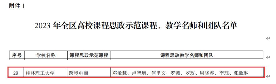近日,自治区教育厅公布了《自治区教育厅关于公布 2023 年全区高校课程思政示范课程和课程思政示范基层教学组织名单的通知》,2138CC太阳集团邓敏慧副教授负责的《跨境电商》课程荣获自治区级课程思政示范课程,获评授课教师和教学团队被认定为自治区级课程思政教学名师和教学团队。