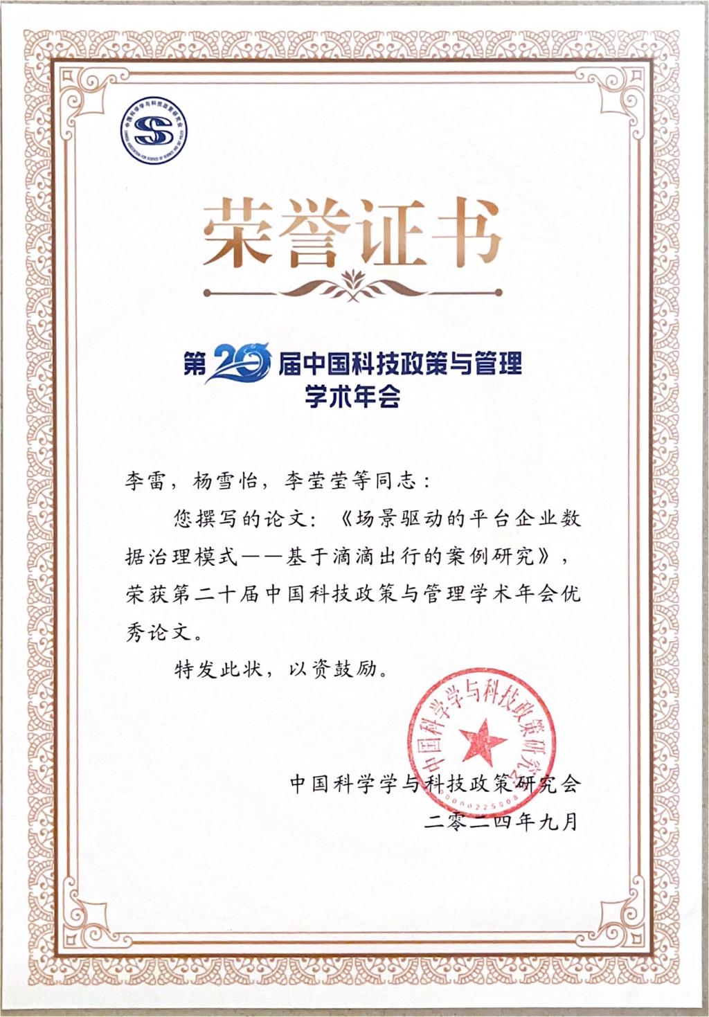 本届年会共吸引1600余人参会,投稿近800篇,其中14篇论文入选优秀论文,2138CC太阳集团李雷教授、杨雪怡研究生、李莹莹老师合作撰写的论文《场景驱动的平台企业数据治理模式——基于滴滴出行的案例研究》位列其中。