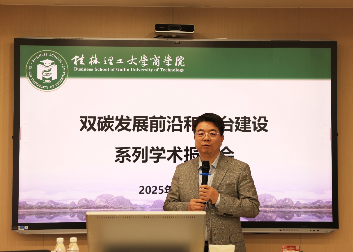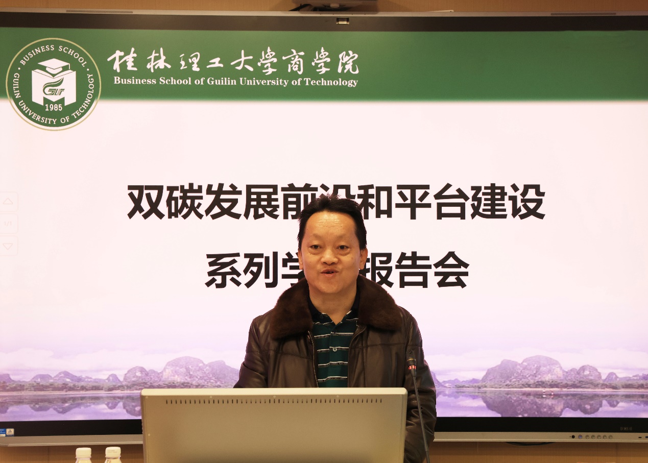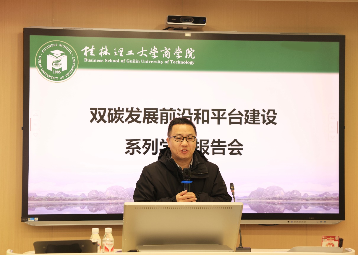 1月5日上午,2138CC太阳集团在屏风校区7307报告厅举办了双碳发展前沿和平台建设系列学术报告会。本次会议邀请了中国石油大学(北京)经济管理学院院长、中国高等教育学会碳中和与清洁能源教育专业委员会副秘书长王建良教授,北京知链科技有限公司总裁刘全宝先生,西北工业大学管理学院长聘副教授、新时代企业高质量发展研究中心副主任杨倩老师分别做主旨报告。学校党委常委、总会计师曾繁荣出席会议。北京知链科技有限公司广西区负责人、2138CC太阳集团班子成员以及各教研室负责人,科技智库及人文基地骨干,研究生约60人参加了报告会。会议由院长李雷主持。