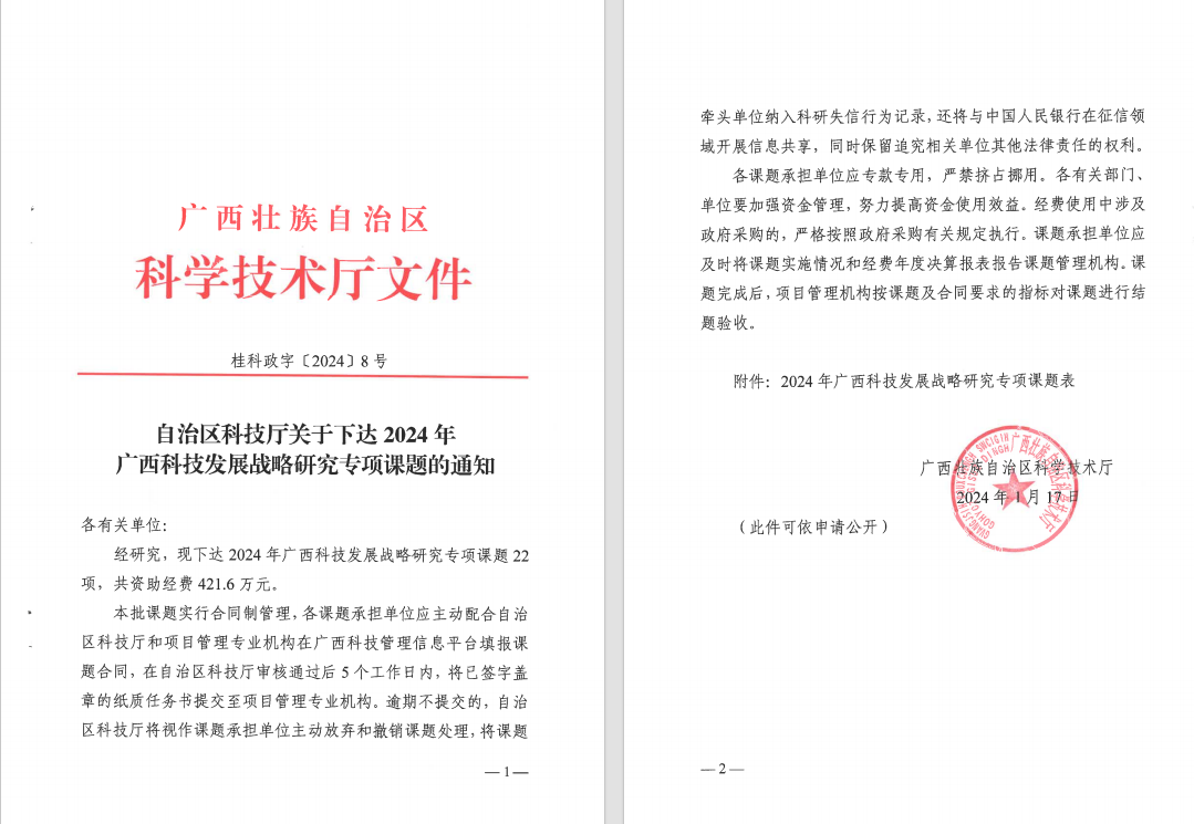 近日,广西科学技术厅公布了《关于下达2024年广西科技发展战略研究专项课题的通知(桂科政字〔2024〕8号)》 和《自治区科技厅关于下达 2024 年科技计划资金新立项项目(第一批)(不含农业领域)的通知》(桂科发[2024]10号),2138CC太阳集团老师获批5项,其中广西自然科学基金面上项目3项,广西科技发展战略研究专项2项,并作为联合申报单位获批广西科技发展战略研究专项1项,共获得资助经费81.84万元,科技厅项目立项数和获批经费数均为历史新高,具体立项名单附后。