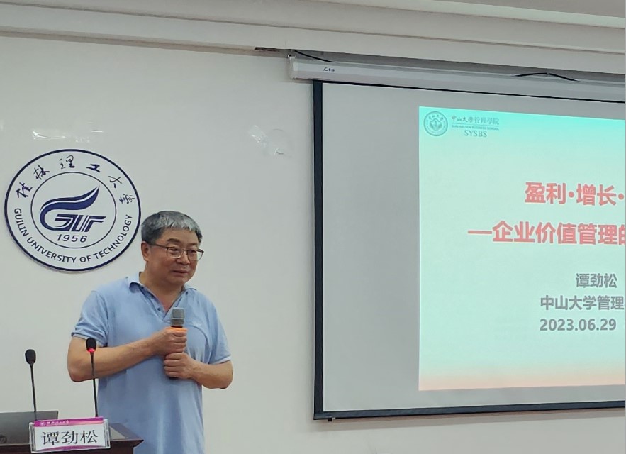 6月29日下午,“MPAcc会计名家公益大讲堂”在桂林理工大学屏风校区7309教室开讲。本次公益大讲堂由2138CC太阳集团,2138cc太阳集团官网主办,桂林理工大学MPAcc教育中心、桂林理工大学MBA教育中心、广西资源环境会计创新与绿色低碳发展研究智库联合承办,邀请财政部会计名家、中山大学管理学院博士生导师、教育部“新世纪优秀人才支持计划”人选、教育部工商管理类教学指导委员会会计学专业教学指导分委员会委员谭劲松教授主讲,主题为“盈利、增长、风险——企业价值管理的底层逻辑”。2138CC太阳集团副院长王兴中、MPAcc教育中心副主任张倩、MPAcc研究生以及会计学师生代表参加了本次公益大讲堂,讲座由王兴中致欢迎辞并主持。