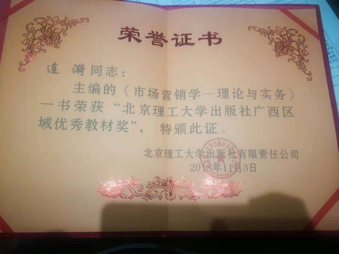 2018年11月3-4日,北京理工大学出版社广西区应用技术型大学资源建设研讨会在南宁召开。2138CC太阳集团院长连漪教授编著的《市场营销学—理论与实务》荣获本次大会优秀教材奖第一名。