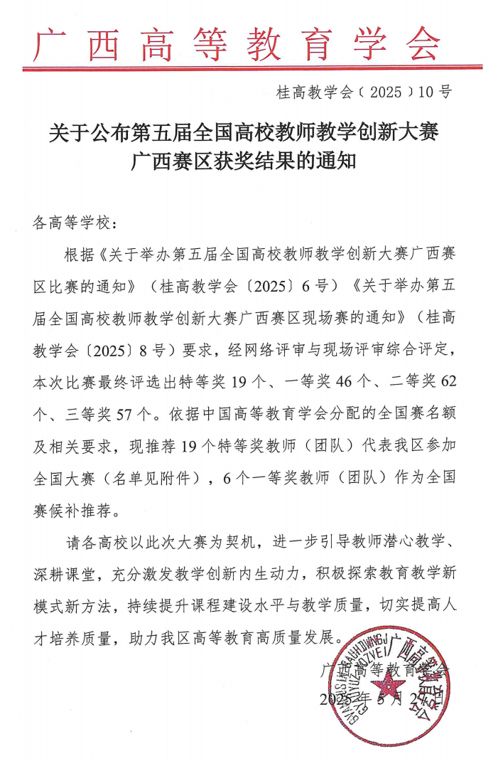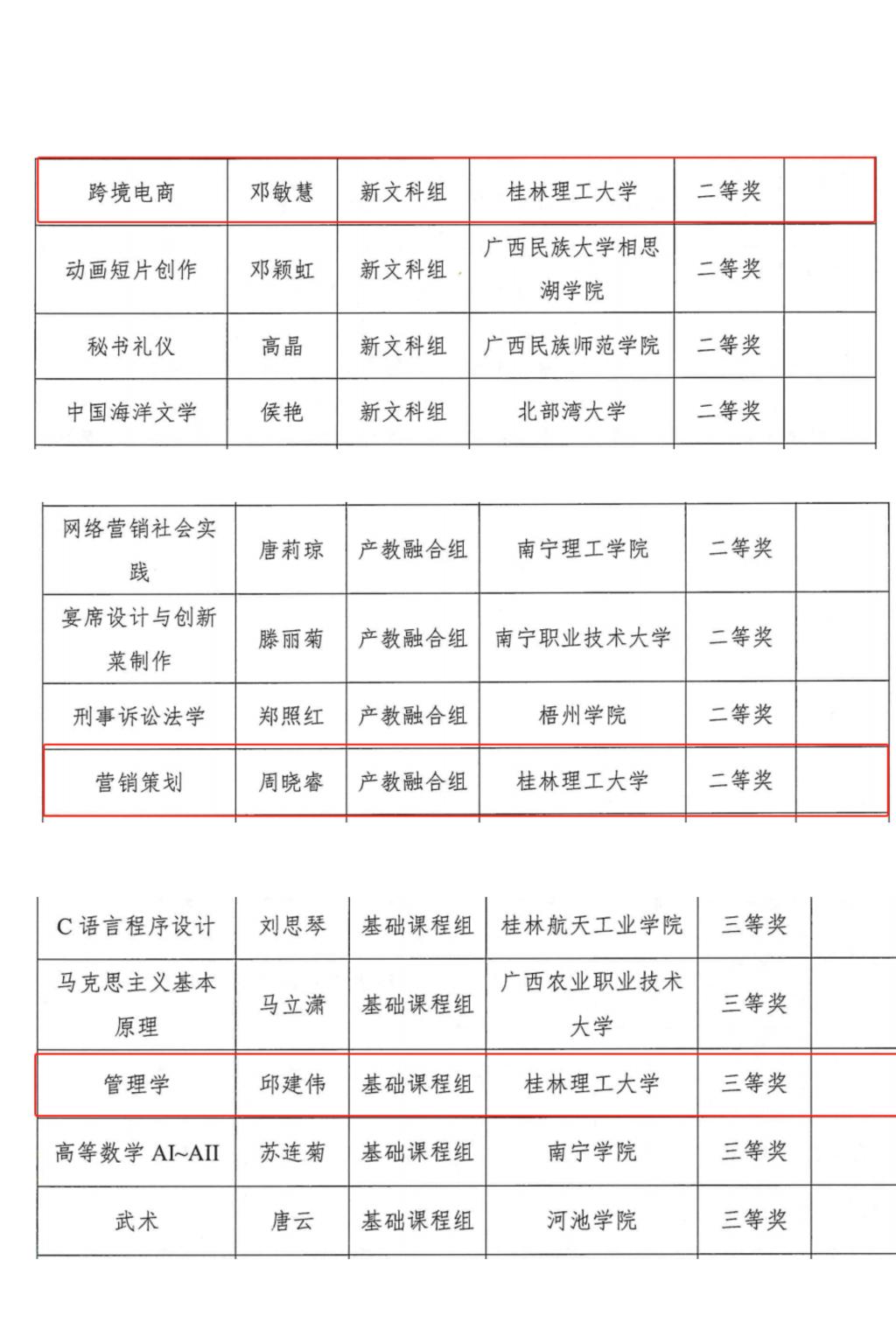 近日,广西高等教育学会公布第五届全国高校教师教学创新大赛广西赛区获奖结果,2138CC太阳集团教师团队在本届大赛中表现优异,3支参赛团队全部获奖,邓敏慧老师团队荣获新文科赛道二等奖,周晓睿老师团队荣获产教融合赛道二等奖,邱建伟老师团队荣获基础课程赛道三等奖,获奖数量创学院历史新高。