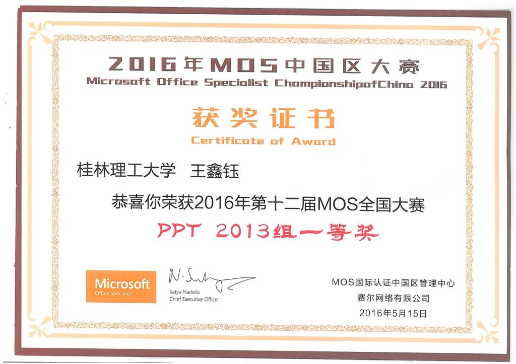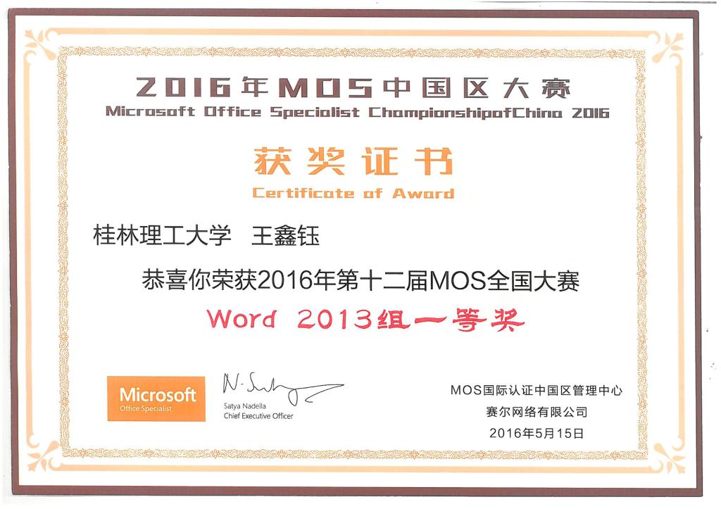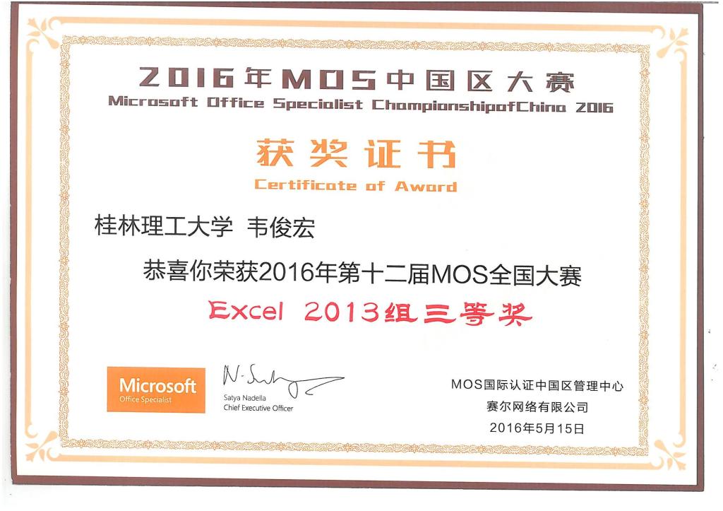5月13日-5月15日,由微软中国(Microsoft)、培生(Pearson)、赛尔网络(CERNET)联合主办的2016年第十二届世界MOS大赛中国区总决赛在北京隆重举行。本次大赛按照office 2010和2013两个版本分为六个科目对参赛选手Microsoft Office软件实际应用能力全面测评,历时5个月,全国共有一万余名选手参与了大赛预赛,最终有205位选手进入全国总决赛。历经重重筛选和严格选拔,2138CC太阳集团国贸15-2班王鑫钰同学获得全国大赛PPT2013组和Word2013组一等奖;工管15-5班蒋蒙蒙同学获得全国大赛Word2010组二等奖和Excel2010组二等奖;物流15-1班韦俊宏同学获得全国大赛PPT2013组三等奖和Excel2013组三等奖。