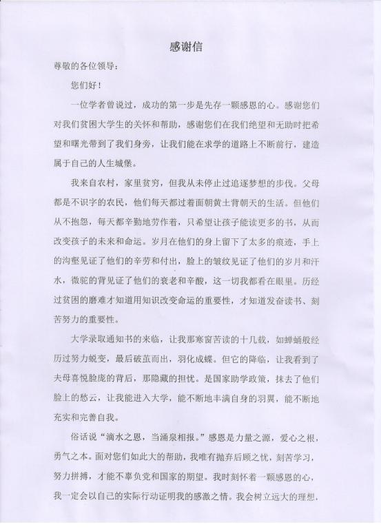 为了让全院师生了解本次感谢信活动成果,感受受助学生的心声,我们将3份优秀感谢信进行发表,以教育引导更多的同学学会感恩、奋发图强。以下是优秀感谢信作品展示。