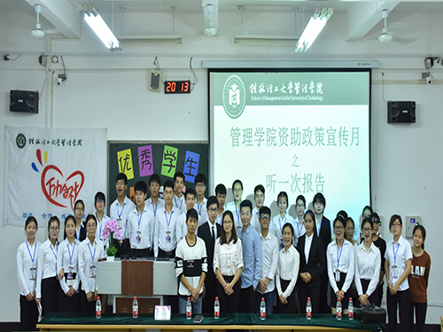 2017年5月16日晚19:00,桂林理工大学管理学院资助政策宣传月之“听一场报告会”,即优秀学生报告会在教九栋9509室隆重举行。学院主要社团负责人及多名贫困生代表共同聆听了此次报告会。