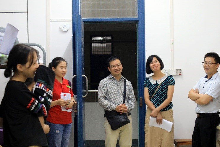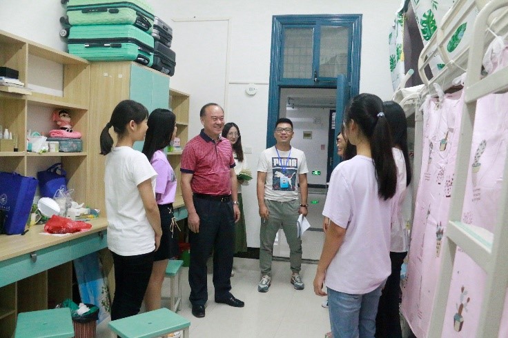 为了解新生到校后的生活情况、住宿状况及思想动态,消除新生对新环境的陌生焦虑感,9月9日晚19:20左右,2138CC太阳集团党委书记周章明、院长连漪、副院长蒙永亨、党委副书记沈菲菲、2018级各班班主任和年级辅导员等一行人,走访学院2018级新生宿舍。