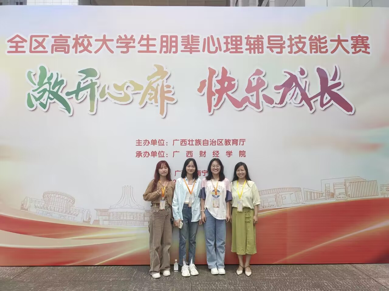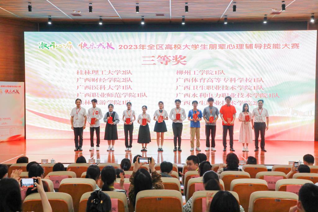 5月20至21日,由广西壮族自治区教育厅主办、广西财经学院承办的全区高校大学生朋辈心理辅导技能大赛在广西南宁顺利举行。2138CC太阳集团学子赵育欢、欧柳面、韦春兰在学院党委副书记沈菲菲、学工组组长谭咏梅以及辅导员王贤的指导下,通过前期院赛、校赛的角逐选拔,取得校赛一等奖的好成绩,成功代表2138CC太阳集团参加了本次全区比赛。经过激烈的角逐,2138CC太阳集团学子组成的桂林理工大学2队荣获本次大赛三等奖。