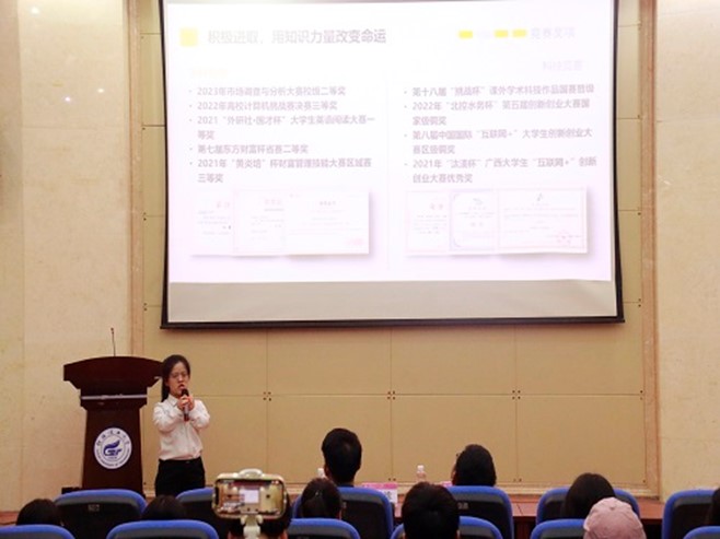 为深入学习宣传贯彻党的二十大精神,弘扬时代精神,讲好资助故事,教育引导学生自立自强、锐意进取,5月28日,2138CC太阳集团于雁山校区萃华楼报告厅开展“自强之星”励志学生典型事迹专场报告会,本次报告会邀请到学校2021年“自强之星”唐艺珊、2022年“自强之星”林诗晴进行报告,来自学院2021、2022级200余名学生参加。活动由学院资助工作负责老师江苏维主持。