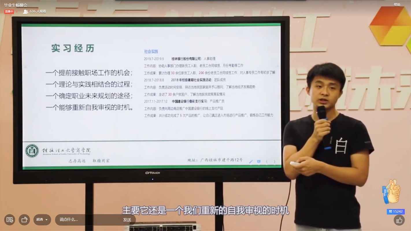 畅聊分享会中,四位优秀毕业生代表结合自身的大学生活实际,围绕大学期间课业学习、学干任职、实践实习、双创竞赛等经历,依次分享了学习、工作、生活等方面的经验和心得。在提问环节中,四位优秀毕业生代表分别对同学们较为关注的话题进行了详细解答并给出指导意见,还为同学们送上寄语,希望同学们能不负青春韶华,以拼搏收获成功。最后,16级辅导员白宇航老师总结道:未来充满了无限的可能,态度和行动才是决定未来的关键。愿同学们能够学会应对各种挑战,从困难中锻炼自己、获得成长,在未来前途似锦的道路上活出本色!