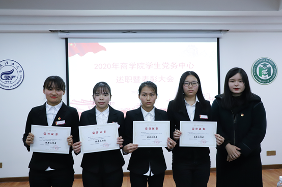 会议首先由主任团以及各部门代表分别就党务中心2020年度工作分模块进行汇报,在回顾过程中进行总结与反思,对来年工作进行计划和展望。随后,学院专职组织员梁译匀老师、学生党务中心指导老师黄维老师、岑甜甜老师分别为获得“优秀工作者”荣誉称号的同学颁发荣誉证书。最后,梁译匀老师进行总结时大力肯定了党务学生干部在过去一年中付出的努力和取得的成果,并提出以下新要求:一是抓责任、强担当。党员同志要坚守初心使命,充分发挥“领头羊”的作用;二是带队伍、作表率。党员同志在严格自己的同时,织密组织的管理网,严格把关各支部的建设,打造能“顶上来”的先锋队伍;三是抓创新、增活力。党员同志要树立创新意识,在开展活动中方法上 “求活”,内容上 “求新”。