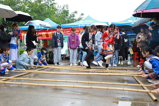 本次三月三民俗运动会共设置了“背篓投球”、“滚铁环”、“板鞋竞速”、“竹竿舞”和“拔河比赛”5个项目,不仅考验个人的运动技能,更注重集体的团结协作。比赛过程中,场上的同学全力以赴、奋力拼搏,尽情体验和享受壮族特色活动带来的乐趣;场下的同学则是为各自的队伍加油助威,呐喊声、助威声、欢呼声如雷贯耳,叫好声连绵不断,比赛气氛层层高涨。