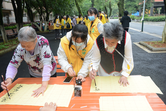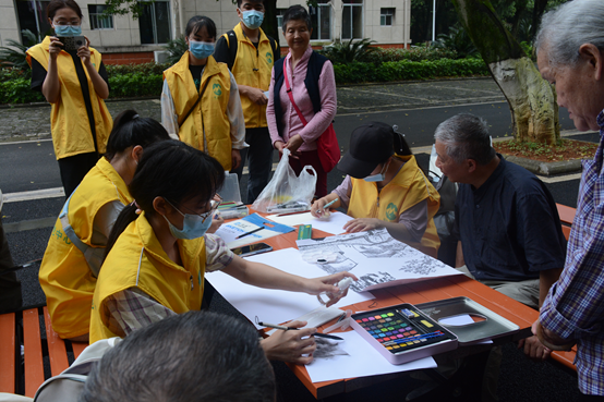 活动当天,志愿者为老人们准备了三个活动。首先是剪纸,在掌握了“折、画、剪”的小窍门后,老人们跃跃欲试,开始了艺术创作。其次是绘画,众多喜爱绘画的老人们齐聚一块,泼墨挥毫、笔走龙蛇,作品涵盖了素描、水墨画、油画等;最后是书法,老人们妙笔丹青、力透纸背,体现了实用性和艺术性的完美结合。此外,当天恰逢一位老人生日,志愿者们都唱起了生日歌,并在阵阵歌声中结束了本次活动。