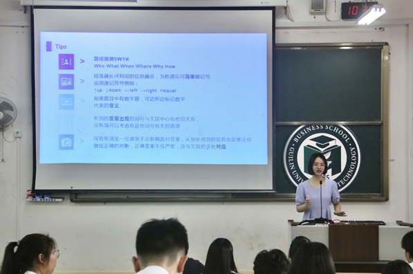 分享会伊始,四位学生代表依次围绕写作、听力、阅读和翻译四个模块为大家分享学习经验,针对性地向学生们介绍英语四六级答题技巧,并建议同学们在平时提高课外阅读量,进行词汇储备,为自身英语能力的提高打好基础。在解答环节,现场的同学们积极踊跃地提出自己备考过程中的疑问,四位学生代表结合自身经历进行详细解答。最后,敖明明老师总结讲话,他对四位分享人的分享内容进行点评总结,并对大一年级英语四六级备考同学提出两点要求:一是摆正心态,积极备考;二是树立信心,诚信考试。他希望同学们结合自身情况,合理借鉴四位分享人的经验,灵活运用应试技巧,认真备考。