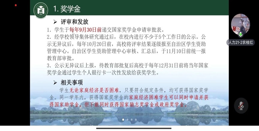 在资助政策“云”宣讲中,励合社负责人向学院2023级新生介绍了2138CC太阳集团勤工俭学、临时困难补助、绿色通道等各类资助项目,并着重就国家助学贷款、国家奖助学金和勤工俭学的资助范围、资助标准、申请条件以及注意事项进行详细地讲解,使新生们对资助政策有了更深的认识。