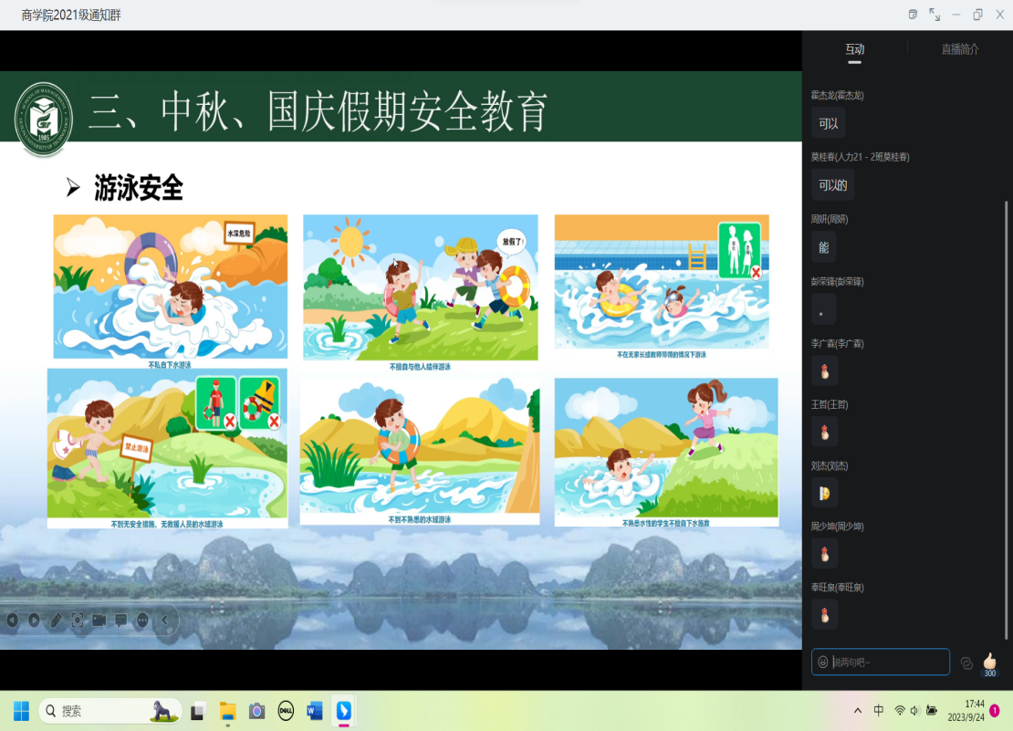 辅导员、班主任通过周末晚教育、主题班会、年级大会、下宿舍走访等多形式,围绕意识形态、舆情、电信诈骗、防溺水、防火灾、心理疾病的意外伤害、校内外交通安全、学生活动场所安全、学生宿舍管理等九个方面开展安全教育,尤其强调预防网络诈骗、禁止私自下水游泳的安全,要求学生严格遵守钉钉请销假制度、学校住宿管理规定,进一步增强了学生的安全防范意识,为切实维护好中秋国庆期间校园的安全稳定和谐打下坚实基础,筑牢校园安全防线。