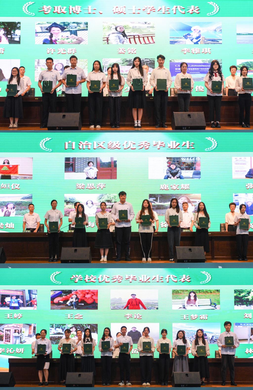 学院副院长卢智增宣读了毕业生相关表彰文件,学院领导班子成员为考取博士研究生、硕士研究生代表以及获得自治区级优秀毕业生和校级优秀毕业生代表赠送毕业纪念品。本科毕业生代表林诗晴、硕士毕业生代表朱少鹏分别回顾在校学习、成长的历程,表达了对学院、老师、父母和同窗的感谢,表示将在新的征程中用实际行动践行桂工精神,奋力谱写商院学子的青春华章。本科生指导教师代表周晓睿和研究生导师代表沈鸿对毕业生们表达了殷切的期望和美好的祝愿。