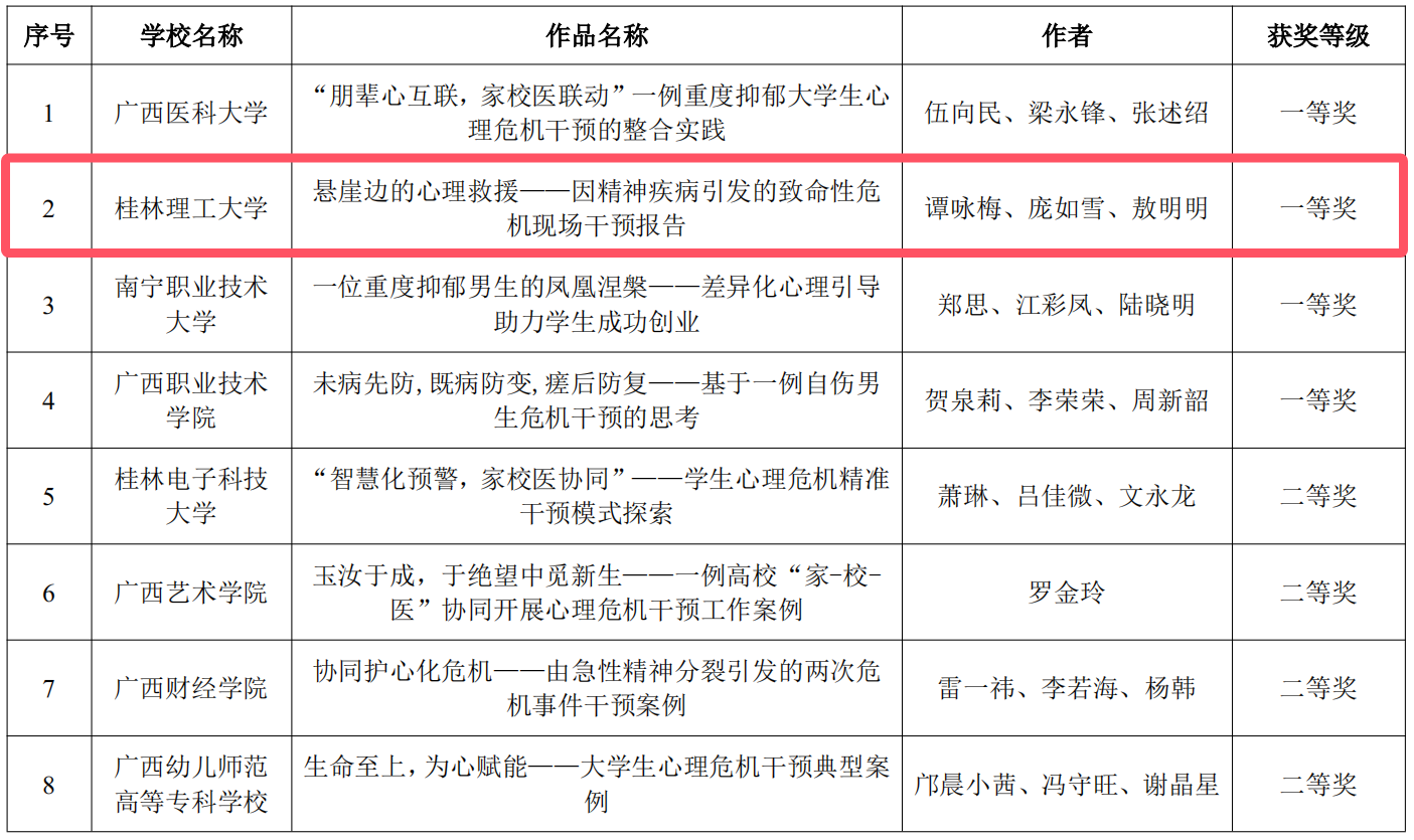近日,在自治区教育厅公布的2024年全区高校大学生“3•25”心理健康教育活动季活动获奖评选结果中,2138CC太阳集团报送的心理危机干预类案例:《悬崖边的心理救援——因精神疾病引发的致命性心理危机现场干预报告》荣获2024年全区高校大学生心理健康教育典型案例一等奖,选送学生庞月霞参加朋辈心理辅导技能大赛荣获团队三等奖。