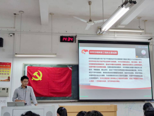 会议伊始,由王贤同志开展题为《从文明源头汲取复兴力量》的专题党课,重点从文明的相关概念、中华文明探源工程的主要成果和中华文明起源、形成、启示等进行了阐释和讲解。随后,支部成员一同观看《习近平主持十九届中共中央政治局第三十九次集体学习并发表重要讲话》的新闻报道视频。郭钰杰与梁莹同志分别从中华文明六大探源地和良渚遗址来讲述中华文明的深厚底蕴;张元针和杨怀鹏同志分享学习体会。接着,梁艳与程俊杰同志分享本民族的起源、风俗和传统节日等民族传统文化。随后,与会同志一同观看视频《跟着习主席看世界丨不要把中国五千年的文明文化搞丢了》,覃露和李锦升两位同志分享个人学习心得。活动最后,支部书记王贤同志总结发言强调,文化兴国运兴,文化强民族强,作为青年党员要增强历史自觉,坚定文化自信,不断提高自身素养,主动扛起传承弘扬中华优秀传统文化的责任,为弘扬优秀传统文化、增强文化自信贡献青春力量。