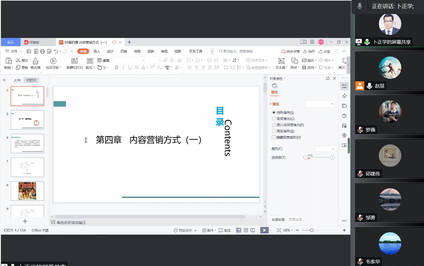 之后,三名同志结合本学期的教学课程知识点,分别分享了课程思政的微课。卜正学同志以电影《长津湖》的情感营销为思政融入点,培养学生的爱国精神和民族自信。邹勇老师以马克思政治经济学的价格公式(商品价值=C+V+M)为融入点,激发学生思考资本驱动经济和知识经济价值分配的异同,突出知识经济时代更加以人为本的发展理念。邱建伟老师以绿色物流为思政融入点,培养学生的环保意识和可持续发展的理念,引导学生在生活和工作中贯彻落实绿色发展的理念和“双碳”目标。